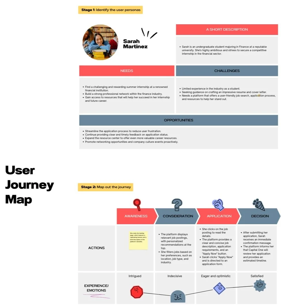These detailed user personas represent a range of users with different backgrounds, goals, and challenges. Understanding these personas will help in designing a platform that caters to the diverse needs of job seekers at capital one, whether they are students, recent graduates, or experienced professionals.