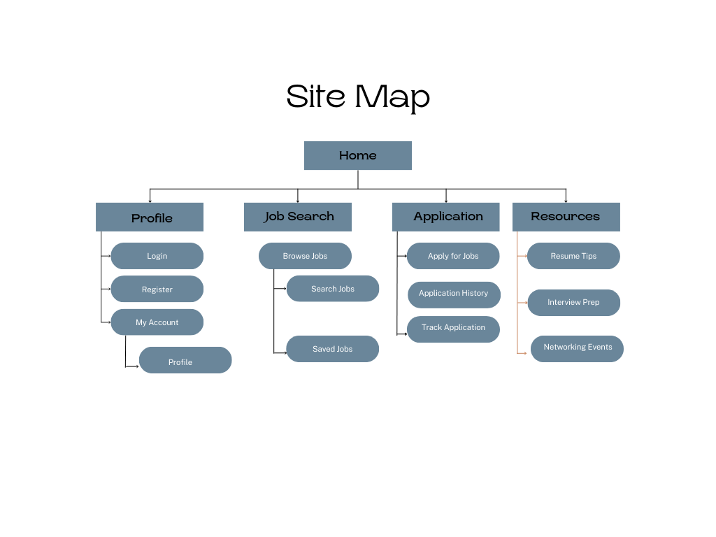 Wireframes: Created Low-fidelity wireframes detailing user flows for profile creation, job browsing, resume customization, and interview scheduling.