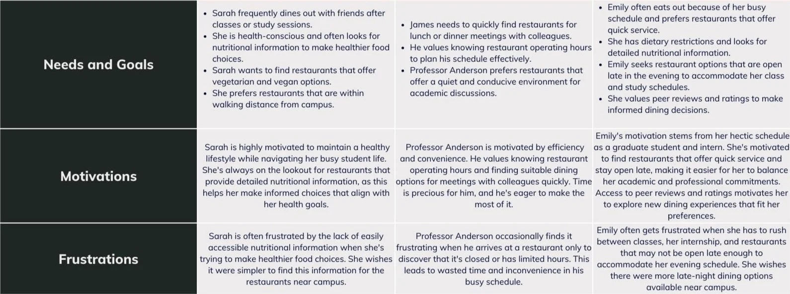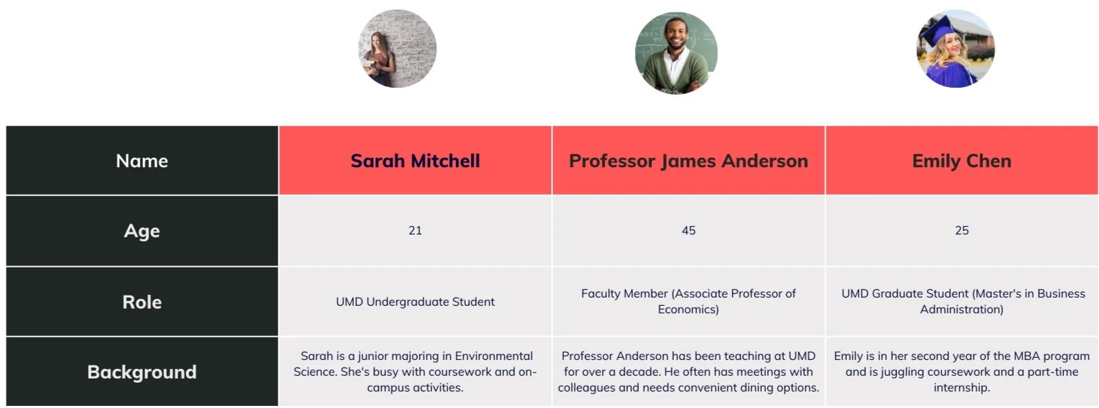 User Personas: Then we made user personas. These user personas represent a diverse range of UMD students and faculty members, each with unique needs and preferences related to dining on campus. Understanding these personas can help tailor our on campus dinning information platform to better serve their specific requirements and improve their dining experiences.
