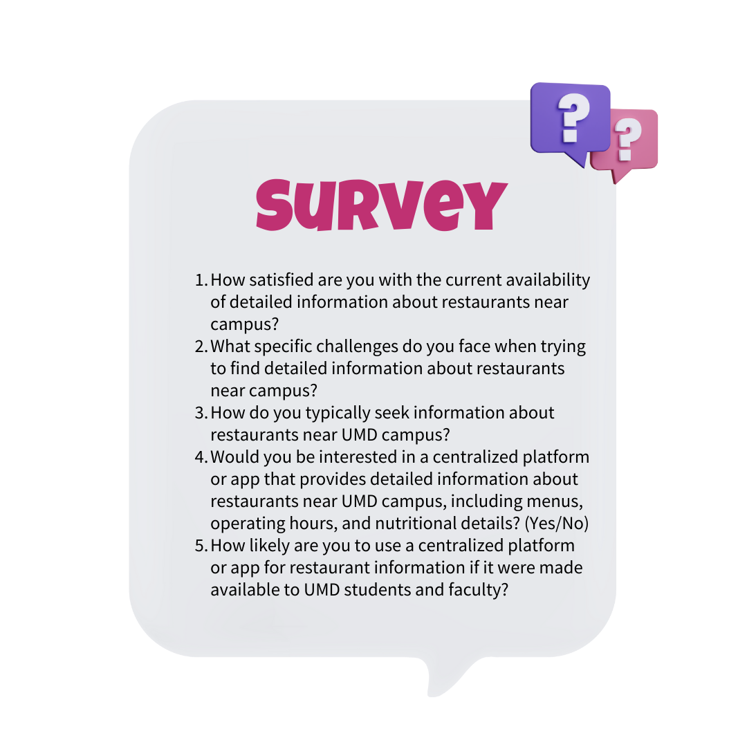 These questions can help gather valuable insights and feedback to address the challenges faced by UMD students and faculty when it comes to finding detailed information about restaurants on campus and improve their overall dining experience.
